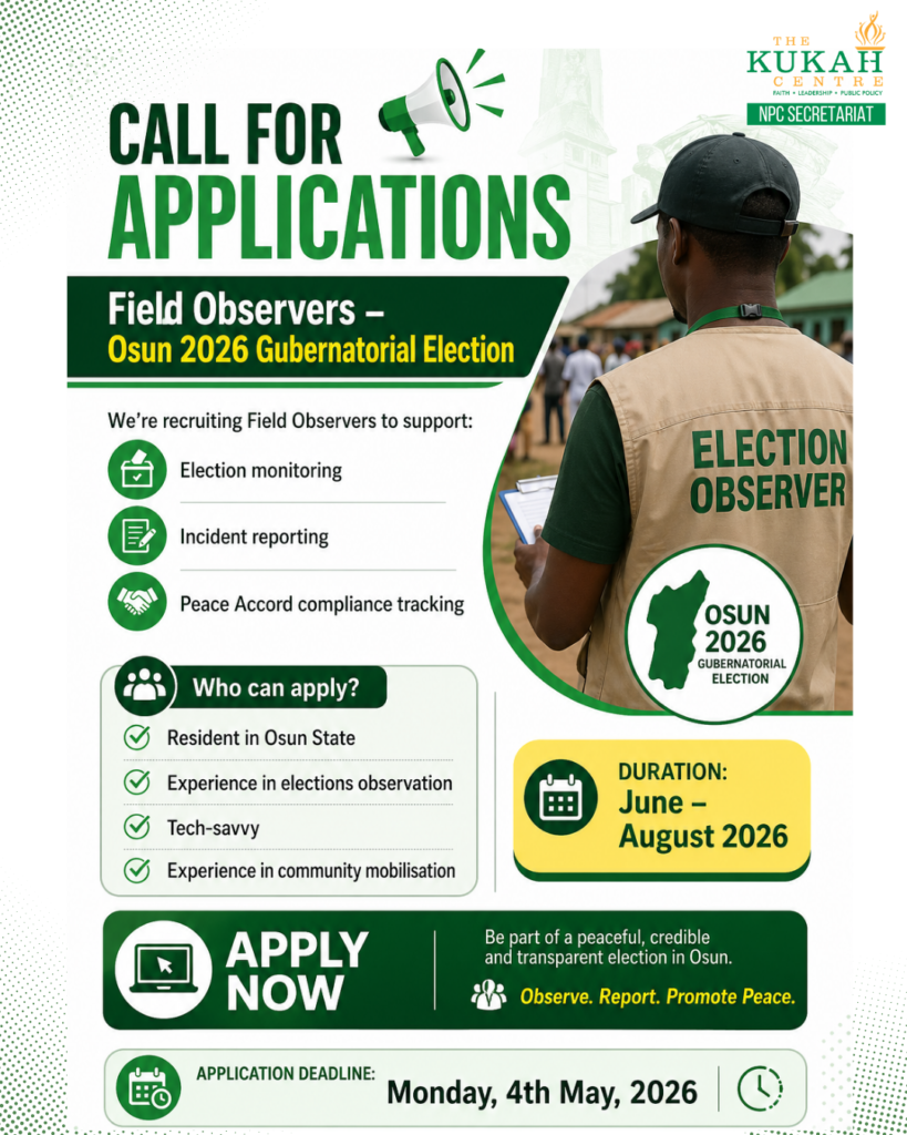 The Kukah Centre for Faith and Leadership Research is hiring to fill the positions of Election Field Observer in Osun State.